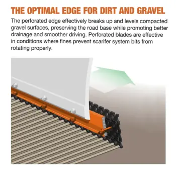The perforations serve multiple purposes. They prevent the sticking that plagues traditional scarifier bits when working with fine-heavy aggregate. They also allow some material to fall through during grading, creating an ideal remix of fines on the road surface for optimal packing. In winter applications, the perforations create a textured surface that improves safety by increasing traction.